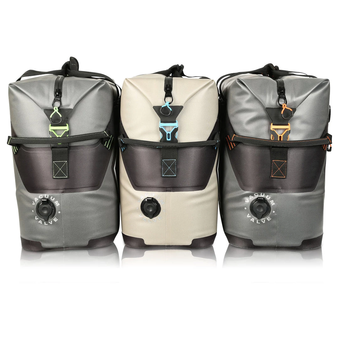 The cooler has closed cell foam insulation, preventing air from passing through it and improving the thermal range of the cooler. With a welded waterproof and air resistant zipper that requires lubrication for optimum function, this cooler has a capacity of 32Qts and can be carried with tote handles or with a single padded strap. Like other ENGEL models, the cooler has an integrated bottle opener. New in this cooler is patent pending vacuum valve technology. Customers should use a vacuum to suck out excess air before the first use for optimum performance.